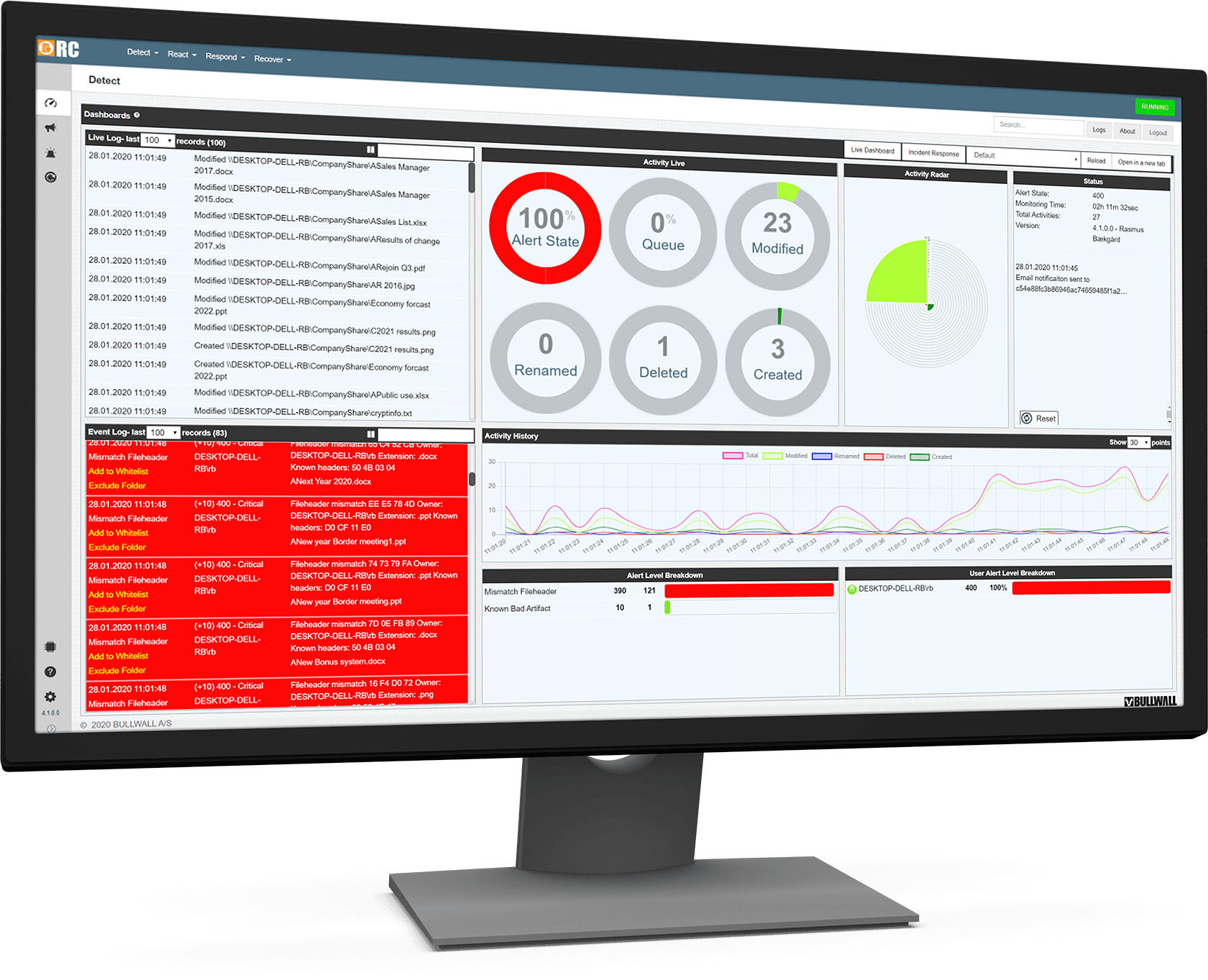 RC can be integrated 2 ways to almost any SIEM and Network Access Control (NAC) solution. RC has a full featured RESTful WebAPI which can be easily adapted and setup, as it comes with pre-configured scripts for most used SIEM and NAC solutions. This secures easy implementation and RC can be tailored to fit your setup solution. Setting up an integration to Cisco ISE, Aruba, Splunk, IBM QRadar, ATP and other solutions can in most cases be done in less than 1 hour. When RC detects a ransomware attack, RC will immediately alert and send information to integrated solutions.