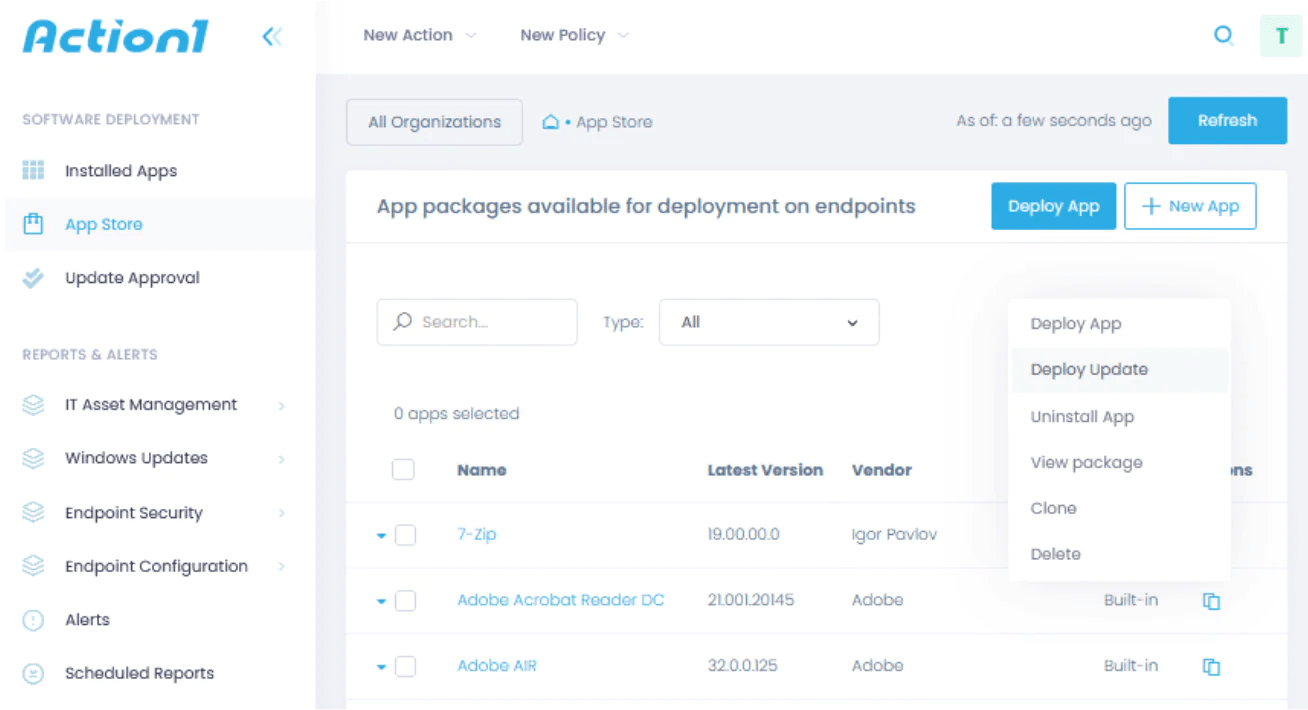 Automatically deploy latest application updates, pre-tested by the Action1 security research team, and save the hassle of checking vendors’ websites for the latest versions. Upload new versions of your custom applications and update them using a unified patching workflow.