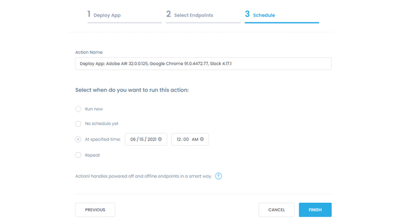 Automate deployment, patching, removal and inventory of software applications across your in-office and remote endpoints at scale. Install software ad-hoc to speed up new user onboarding, or en masse to roll out new software and execute software migration projects. Automated software deployment saves time you and your IT team can spend on more strategic initiatives.