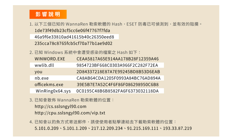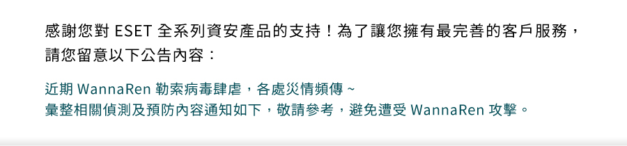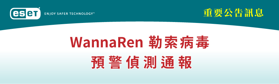 WannaRen預警偵測通報 最近發現WannaRen勒索病毒肆虐,各處災情頻傳。Version 2 Limited為ESET總代理,彙整以下偵測預防方案,供各位參考預防、避免遭受WannaRem攻擊。 1. 以下三個已知的WannaRen勒索軟體的Hash,ESET防毒已可偵測到,並有效的阻攔。 1de73f49db23cf5cc6e06f47767f7fda 46a9f6e33810ad41615b40c26350eed8 235cca78c8765fcb5cf70a77b1ae9d02 2. 已知Windows系統中會遭受感染的檔案之Hash如下: WINWORD.EXE CEAA5817A65E914AA178B28F12359A46 wwlib.dll 9854723BF668C0303A966F2C282F72EA you 2D84337218E87A7E99245BD8B53D6EAB nb.exe CA8AB64CDA1205F0993A84BC76AD894A officekms.exe 39E5B7E7A52C4F6F86F086298950C6B8 WinRing0x64.sys 0C0195C48B6B8582FA6F6373032118DA 3. 已知會散佈WannaRen勒索軟體的位置: 4. 已知會以釣魚方式寄送郵件,誘使使用者點擊連結去下載勒索軟體的位置: 5.101.0.209、5.101.1.209、217.12.209.234、91.215.169.111、193.33.87.219 建議: 1. 於ESET防火牆或Windows防火牆中直接阻擋這些位置: 和這些IP。 5.101.0.209、5.101.1.209、217.12.209.234、91.215.169.111、193.33.87.219 2. 搜尋電腦中的WINWORD.EXE、wwlib.dll、you、nb.exe、officekms.exe、WinRing0x64.sys,並提交給ESET分析,確認是否真的已遭受感染。 3. 以上Hash或IP與網站位置,可以透過IPS/IDS製作偵測規則,透過IPS/IDS進行預警與防禦。以下是以SNORT為範例製作的偵測參考規則: alert tcp $HOME_NET any <> $HOME_NET any (msg:”Deleted: Payload Ransomware Detected”; flow:from_server,established; content:”|0C0195C48B6B8582FA6F6373032118DA|”; depth:500; metadata:created_at 2020_05_04, updated_at 2020_05_13; priority:1; classtype:malware-cnc; sid:1002000346; rev:12;) WannaRen ESET